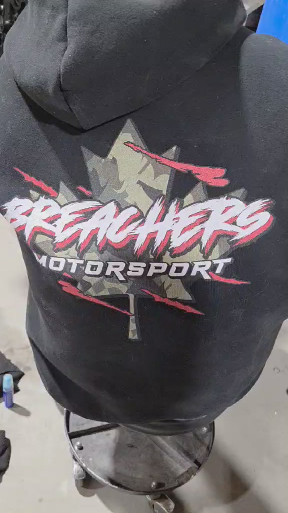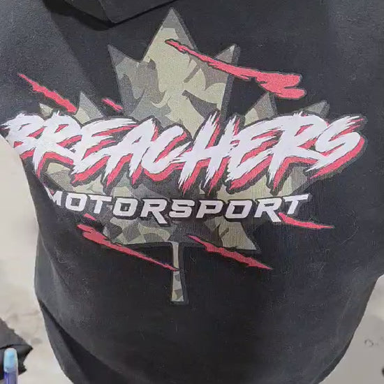 On the front, a red "HELLO, MY NAME IS: BREACHER" label reminds us that each wearer is an integral part of the squad. The back features the iconic Breachers Motorsport logo against a camouflage maple leaf background—a symbol of Canadian strength and unity in adversity.